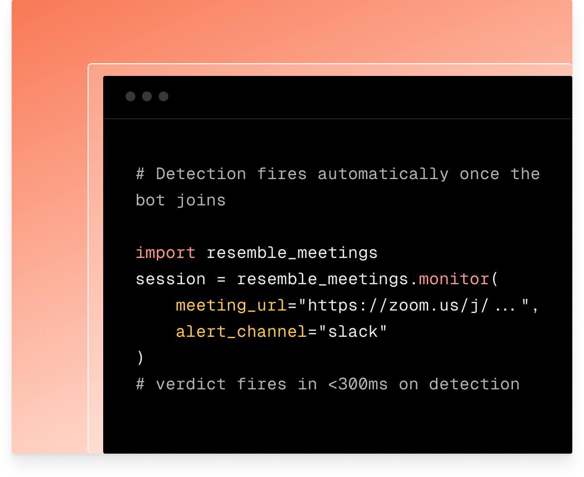 3 billion parameters validated against 160+ generative AI tools. Rather than matching against a library of known fakes, DETECT-3B Omni learns the statistical artifacts that generative architectures leave behind. Delivered seamlessly via an automated security bot that joins your calls.