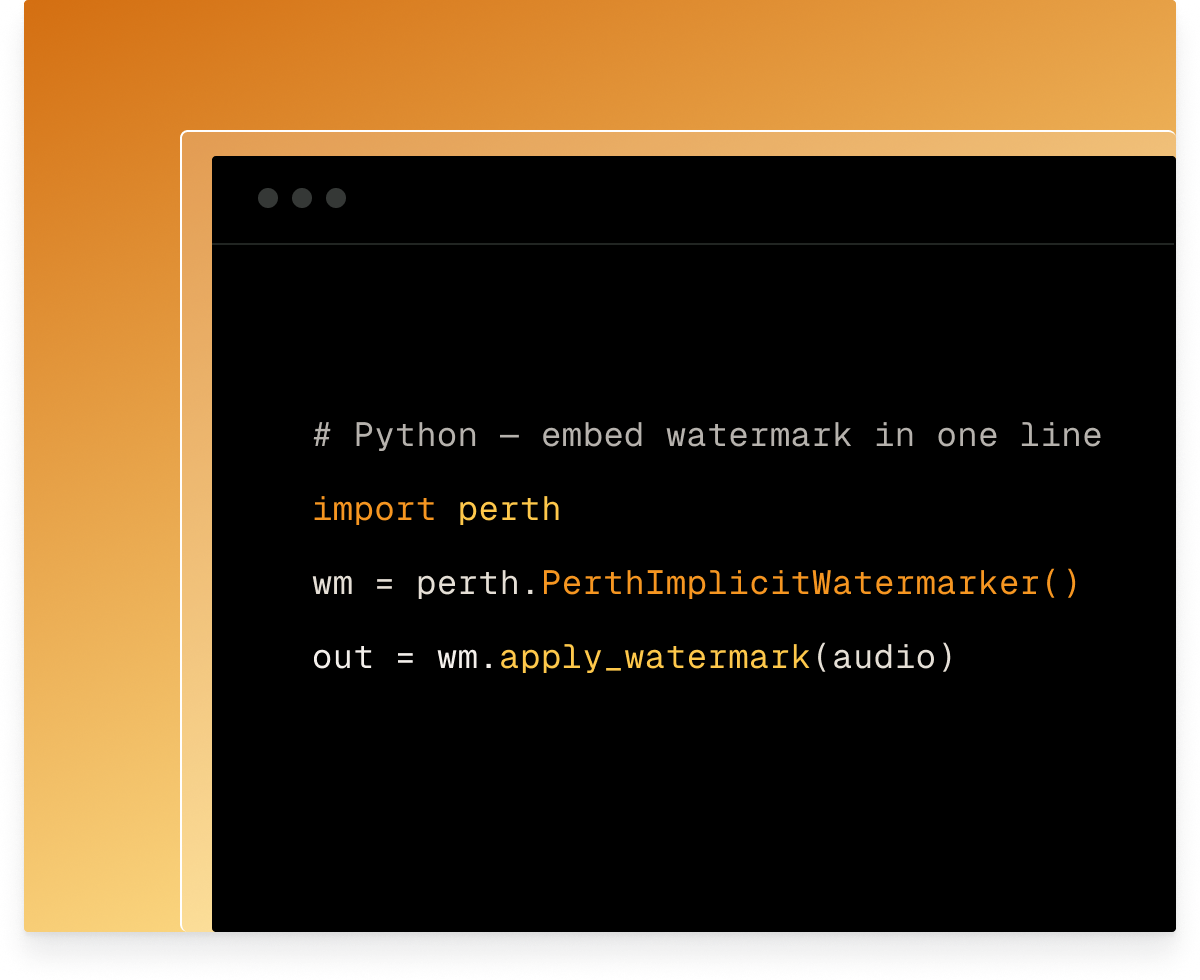 Our own watermarker model, PerTh is embedded at the limit of human perception. It pushes the watermark to a perceptual threshold where removal would cause so much damage, it would render the file useless. MIT licensed VideoSeal is used to watermark images and video.