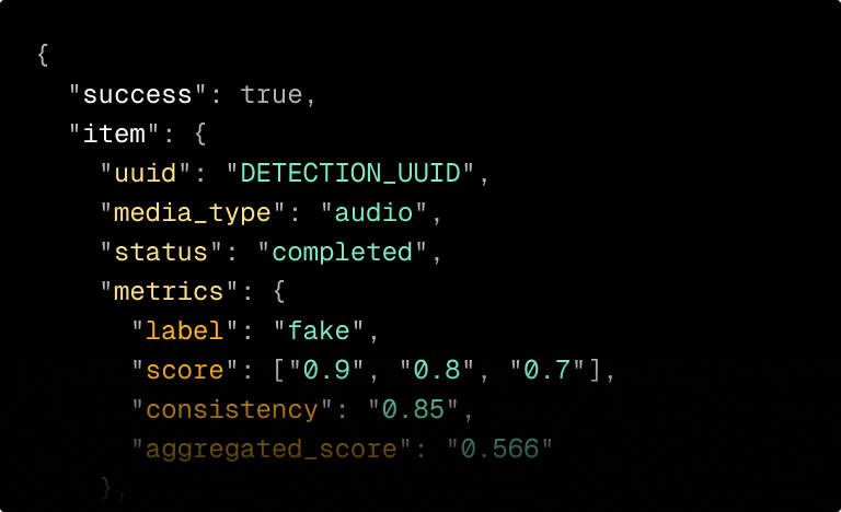Verdict in under 300ms. Intelligence surfaces anomaly signals and explanation of why audio was flagged.