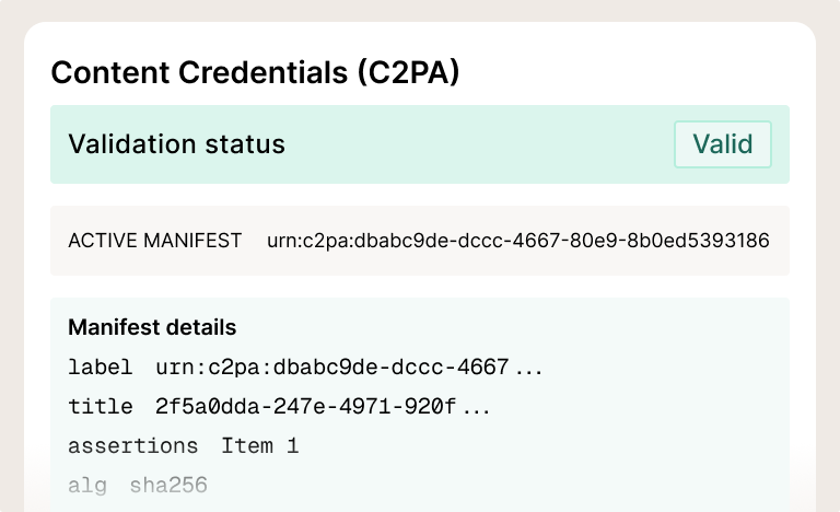 Every file is enrolled in C2PA by default. If the manifest is stripped, the embedded watermark acts as a fallback provenance signal.