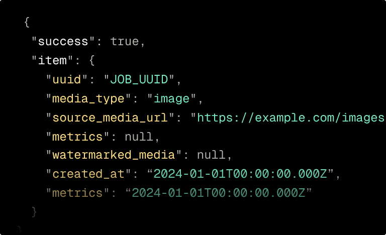 Submit any file. Resemble detects and processes images or videos and applies the appropriate watermark. No configuration per file type required.